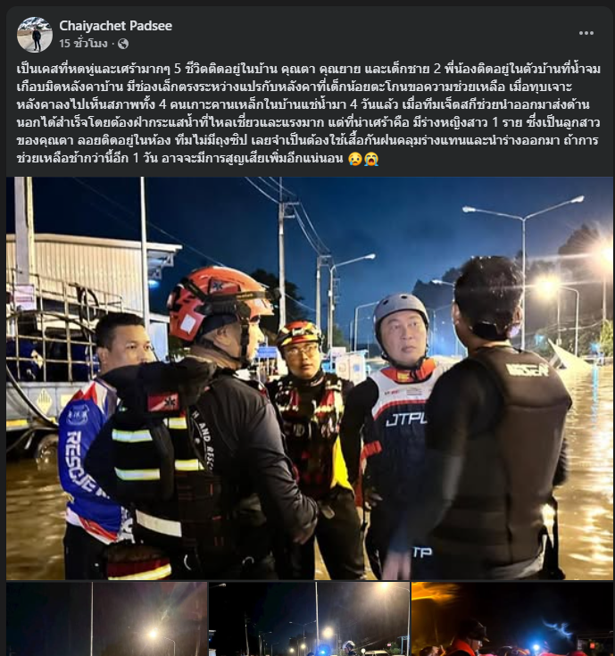ล่าสุด สมาชิกเฟซบุ๊ก Chaiyachet Padsee ซึ่งเป็นเจ้าหน้าที่ที่เข้าไปช่วยอพยพชาวบ้าน โพสต์เคสสุดหดหู่ หลังเจอบ้านหลังหนึ่ง มีคนติดอยู่หลายคน และพบผู้เสียชีวิตด้วย โดยระบุว่า เป็นเคสที่หดหู่และเศร้ามากๆ 5 ชีวิตติดอยู่ในบ้าน คุณตา คุณยาย และเด็กชาย 2 พี่น้องติดอยู่ในตัวบ้านที่น้ำจมเกือบมิดหลังคาบ้าน มีช่องเล็กตรงระหว่างแปรกับหลังคาที่เด็กน้อยตะโกนขอความช่วยเหลือ