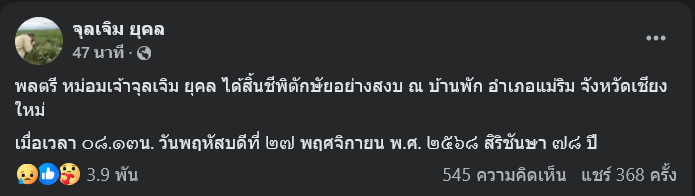 วันที่ 27 พฤศจิกายน 2567 มีรายงานว่า เฟซบุ๊ก จุลเจิม ยุคล ได้โพสต์ข้อความแจ้งข่าวว่า พลตรี หม่อมเจ้าจุลเจิม ยุคล ได้สิ้นชีพิตักษัยอย่างสงบ ณ บ้านพัก อำเภอแม่ริม จังหวัดเชียงใหม่ เมื่อเวลา 08.13 น. วันพฤหัสบดีที่ 27 พฤศจิกายน พ.ศ. 2568 สิริชันษา 78 ปี