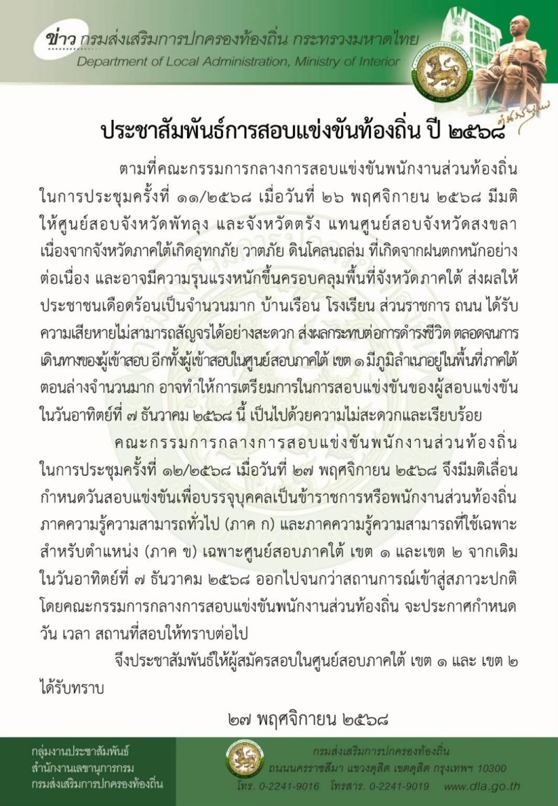 วันที่ 27 พฤศจิกายน 2568 คณะกรรมการกลางการสอบแข่งขันพนักงานส่วนท้องถิ่น (กสถ.) แจ้งผลการพิจารณามติเลื่อนสอบท้องถิ่น 68 เฉพาะศูนย์สอบภาคใต้ เขต 1 และเขต 2 ออกไปก่อน เนื่องจากสถานการณ์น้ำท่วมในหลายจังหวัดภาคใต้ยังไม่เข้าสู่ภาวะปกติ