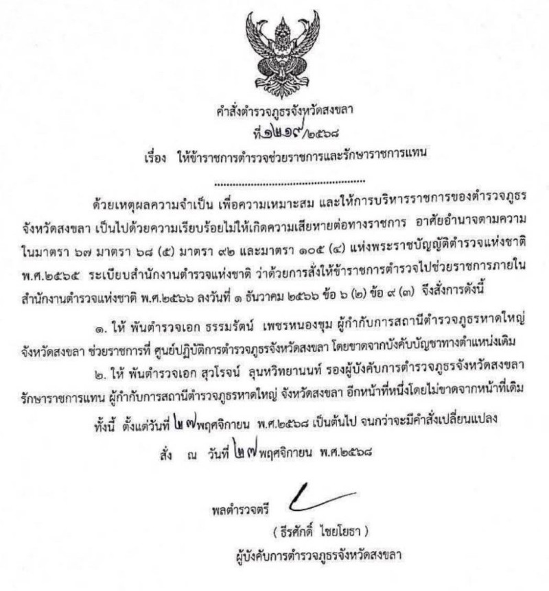 วันที่ 27 พฤศจิกายน 2568 พลตำรวจตรี ธีรศักดิ์ ไชยโยธา ผู้บังคับการตำรวจภูธรจังหวัดสงขลา ออกคำสั่งตำรวจภูธรจังหวัดสงขลา ที่ 387/2568 เรื่อง ให้ข้าราชการตำรวจช่วยราชการและรักษาราชการแทน