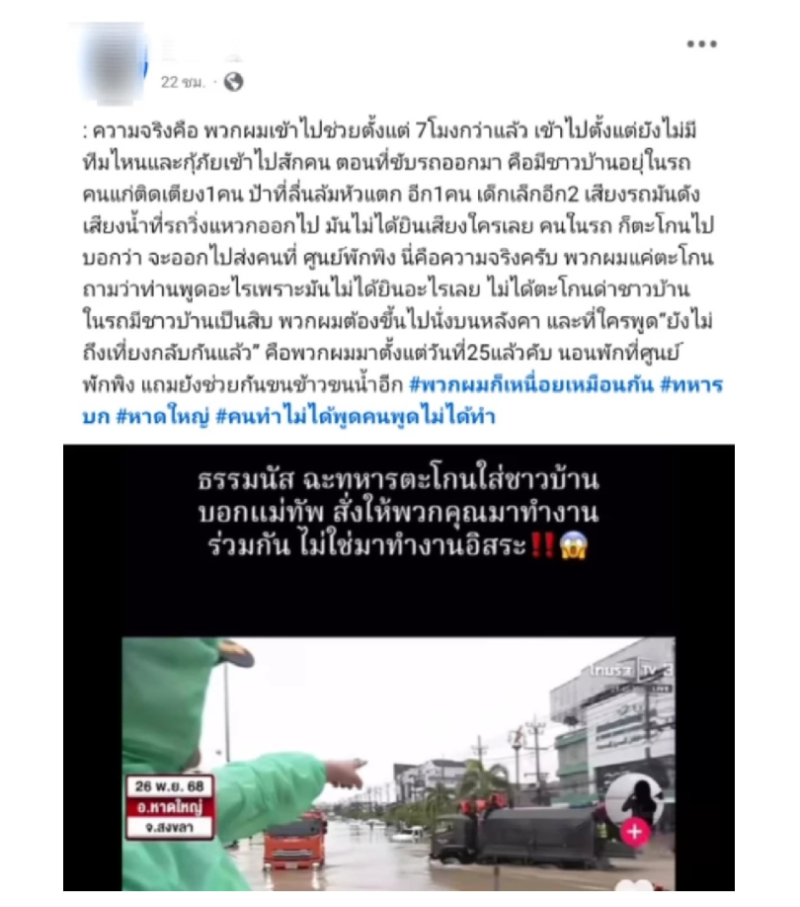 เจ้าตัวยังระบุว่า เสียงเครื่องยนต์และน้ำที่กระแทก ทำให้ไม่ได้ยินคำพูดจากภายนอก จึงตะโกนถามว่า “ท่านพูดอะไร” ไม่ได้มีเจตนาด่าหรือข่มขู่ชาวบ้าน พร้อมชี้ว่า ทหารหลายคนต้องขึ้นไปนั่งบนหลังคารถเพื่อช่วยประชาชน และทีมยังทำงานต่อเนื่องตั้งแต่วันที่ 25 พฤศจิกายนที่ผ่านมา ทหารผู้ชี้แจงทิ้งท้ายว่า แม้การทำงานจะเหน็ดเหนื่อย แต่ทุกคนยังตั้งใจปฏิบัติภารกิจเพื่อช่วยประชาชนอย่างเต็มที่