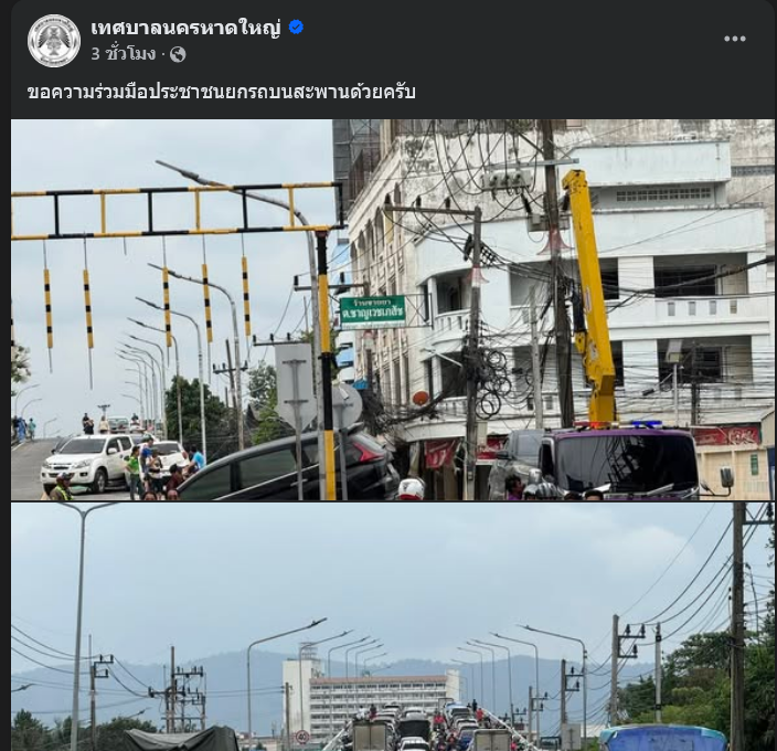 ทำเอาทัวร์ลงอีกครั้ง หลังเพจเฟซบุ๊ก เทศบาลนครหาดใหญ่ ได้โพสต์ภาพพร้อมข้อความระบุว่า ขอความร่วมมือประชาชนยกรถบนสะพานด้วยครับ
