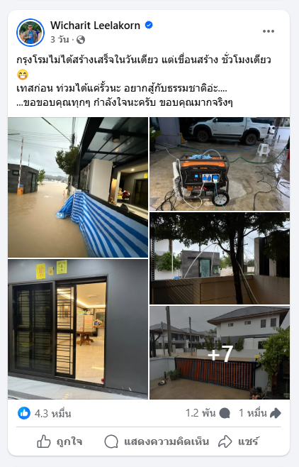 โดยล่าสุดเจ้าของบ้านเปิดเผยกับสำนักข่าวว่า ตอนเห็นน้ำขึ้นเร็วกว่าปกติ รีบออกไปซื้อเครื่องปั่นไฟ ผ้าใบ และอุปกรณ์ต่าง ๆ แบบแข่งกับเวลา ก่อนกลับมาลงมือทำแนวป้องกันน้ำ ใช้เวลาแค่หนึ่งชั่วโมงก็เสร็จ ผลคือ รอบน้ำขึ้นครั้งถัดมา บ้านไม่ท่วม แถมยังกลายเป็นบ้านเดียวในโครงการที่ไฟไม่ดับ
