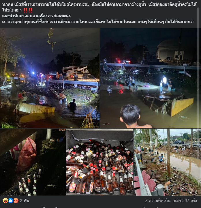 วันที่ 28 พ.ย.2568 เจ้าของเพจเฟซบุ๊ก โบนี่ ทวิตา ได้โพสต์ข้อความพร้อมภาพประกอบ โดยมีข้อความระบุว่า ทุกคน เบียร์ที่เราเอามาขายไม่ได้ขโมยใครมานะคะ น้องมันไปดำเอามาจากข้างคูน้ำ เบียร์ลอยมาติดคูน้ำค่ะไม่ได้ไปขโมยมา แนะนำทักมาสอบถามเรื่องราวก่อนนะคะ เราแจ้งลูกค้าทุกคนที่ซื้อกับเราว่าเบียร์มาจากไหน และก็แทบไม่ได้ขายใครเลย แบ่งๆให้เพื่อนๆ กันไปกินมากกว่า