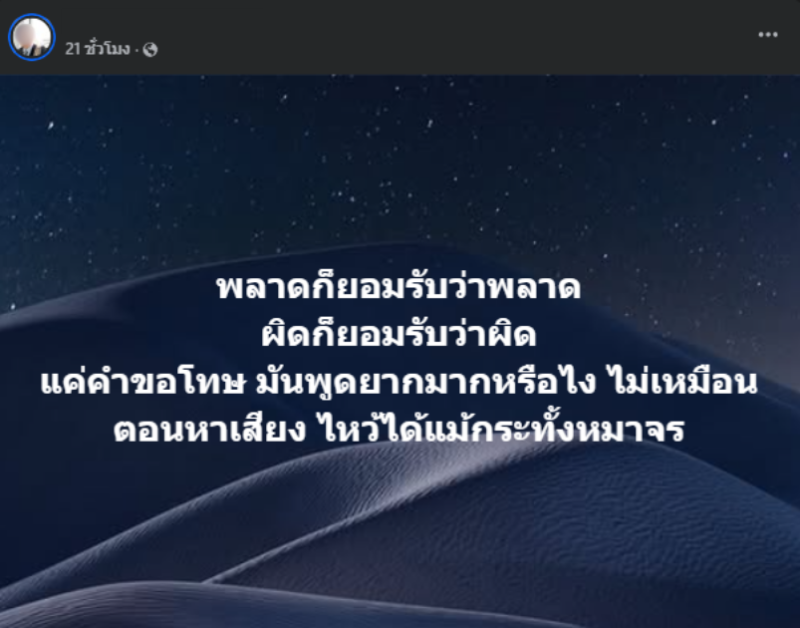 ด้านความเคลื่อนไหวล่าสุดบนเฟซบุ๊กของทนายดัง เมื่อวันที่ 28 พฤศจิกายนที่ผ่านมา ได้โพสต์ข้อความว่า พลาดก็ยอมรับว่าพลาด ผิดก็ยอมรับว่าผิด แค่คำขอโทษ มันพูดยากมากหรือไง ไม่เหมือนตอนหาเสียง ไหว้ได้แม้กระทั้งหมาจร