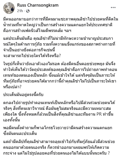 กลายเป็นประเด็นร้อนบนโลกโซเชียลอีกครั้ง หลังนายรัศม์ ชาลีจันทร์ อดีตผู้ช่วยรัฐมนตรี โพสต์เฟซบุ๊กตั้งคำถามเรื่องการช่วยเหลือผู้ประสบภัยน้ำท่วมที่หาดใหญ่ของ ลิซ่า ว่าเป็นการช่วยจริงหรือเพื่อสร้างคอนเทนต์ ซึ่งทางด้านไอซ์ รักชนก ออกมาโพสมาปกป้องลิซ่าเช่นกันค่ะ ซึ่งจะมีอะไรเพิ่มติมบ้างรับชมกันได้เลยค่ะ