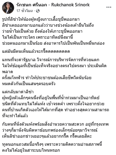 โดยรักชนก ระบุผ่านเพจเฟสบุ๊คส่วนตัวว่า รูปที่ลิซ่าให้น้องผู้หญิงเกาะเสื้อชูชีพออกมา ลิซ่าเคยชี้แจงแล้วว่าในบางช่วงน้องยืนไม่ถึง และว่ายน้ำไม่เป็น จึงต้องให้เกาะชูชีพ ไม่ได้สร้างภาระใด เพราะตลอดสัปดาห์ที่ผ่านมา ลิซ่าช่วยคนออกมาเป็นร้อย และส่งอาหารไปเป็นพันเป็นหมื่นกล่อง