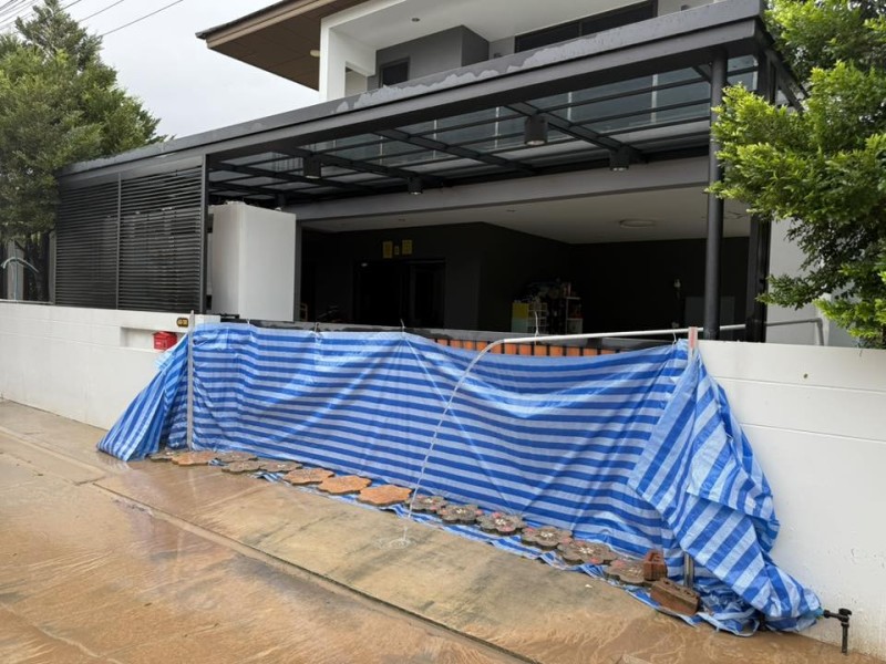 นายวิชาฤทธิ์ เจ้าของบ้าน เปิดเผยว่า รอบแรกน้ำทะลักเข้าบ้านระดับหัวเข่า แต่เมื่อระดับน้ำลดลงได้รีบจัดหาอุปกรณ์ เช่น เครื่องปั่นไฟ ผ้าใบ เหล็ก ก้อนหิน รวมถึงปั๊มน้ำและเครื่องสูบน้ำ มาติดตั้งแนวกั้นบริเวณหน้าบ้านและโรงจอดรถ ใช้เวลาเพียง 1 ชั่วโมง หลังจากนั้นรอบถัดมาที่ระดับน้ำสูงกว่า 70 เซนติเมตร น้ำก็ไม่สามารถไหลเข้าบ้านได้อีก