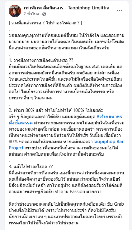 โดย เท่าพิภพ ส.ส.พรรคประชาชน เขาเผยว่า สาเหตุที่ไม่ไปต่อ เพราะมั่นใจในทีมรุ่นใหม่ของพรรค เชื่อว่า 80% ของผลงานที่ทำไว้ จะถูกสานต่อได้แน่นอน พร้อมฝากประชาชนให้สนับสนุนคนรุ่นใหม่เหล่านั้นต่อไป เท่าพิภพยังบอกว่า หลังออกจาก สนช. ต้องกลับไปหารายได้เลี้ยงชีพทั้งงานมัคคุเทศก์ งานขับ Grab และธุรกิจ และ ธุรกิจอื่นๆ อีกมากมาย