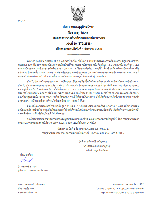 วันที่ 1 พฤศจิกายน 2568 กรมอุตุนิยมวิทยา ประกาศ เรื่อง พายุ โคโตะ และอากาศหนาวเย็นบริเวณประเทศไทยตอนบน ฉบับที่ 10 (372/2568) (มีผลกระทบจนถึงวันที่ 1 ธันวาคม 2568)