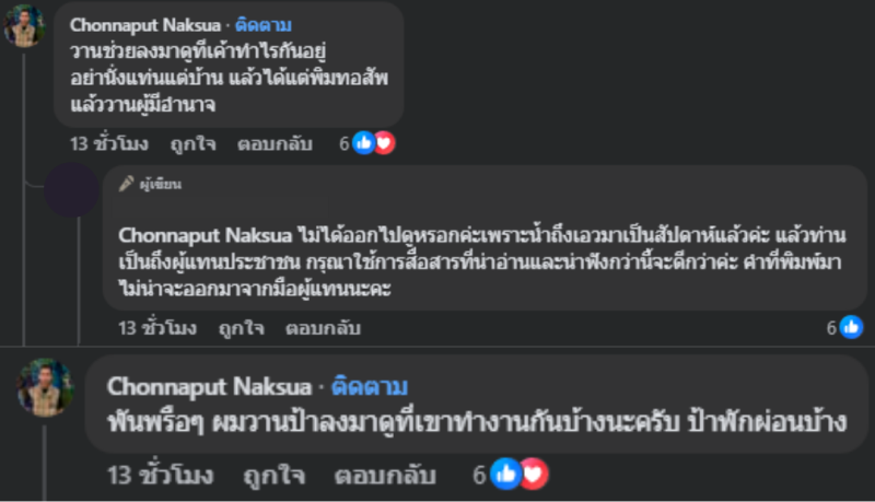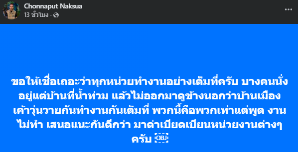 ด้านนายชนนพัฒฐ์ ได้โพสต์ข้อความเพิ่มเติมผ่านเฟซบุ๊กส่วนตัว Chonnaput Naksua ระบุว่า ขอให้เชื่อเถอะว่าทุกหน่วยทำงานอย่างเต็มที่ครับ บางคนนั่งอยู่แต่บ้านที่น้ำท่วม แล้วไม่ออกมาดูข้างนอกว่าบ้านเมืองเค้าวุ่นวายกันทำงานกันเต็มที่ พวกนี้คือพวกเท่าแต่พูด งานไม่ทำ เสนอแนะกันดีกว่า มาด่าเบียดเบียนหน่วยงานต่างๆ ครับ
