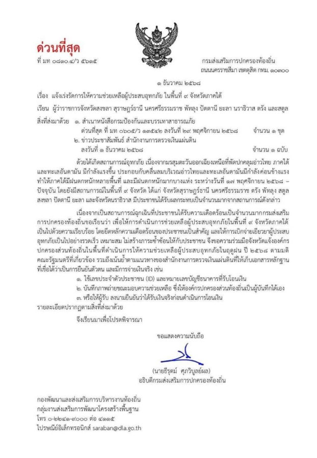 วันที่ 1 ธ.ค. 2568 นายธีรุตม์ ศุภวิบูลย์ผล อธิบดีกรมส่งเสริมการปกครองท้องถิ่น (สถ.) ทำหนังสือด่วนที่สุด เมื่อวันที่ 1 ธ.ค. 68 ถึงผู้ว่าราชการจังหวัดสงขลา สุราษฎร์ธานี นครศรีธรรมราช พัทลุง ปัตตานี ยะลา นราธิวาส ตรัง และสตูล เรื่อง แจ้งเร่งรัดการให้ความช่วยเหลือผู้ประสบอุทกภัย ในพื้นที่ 9 จังหวัดภาคใต้