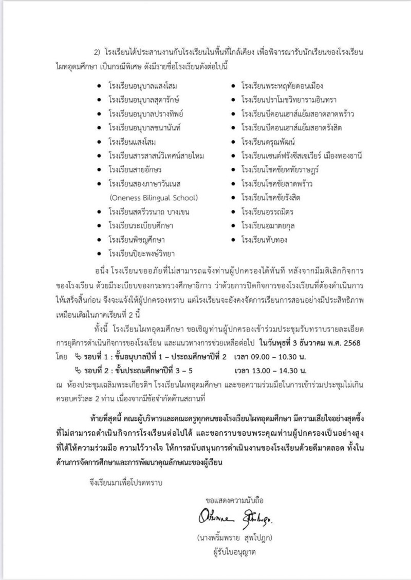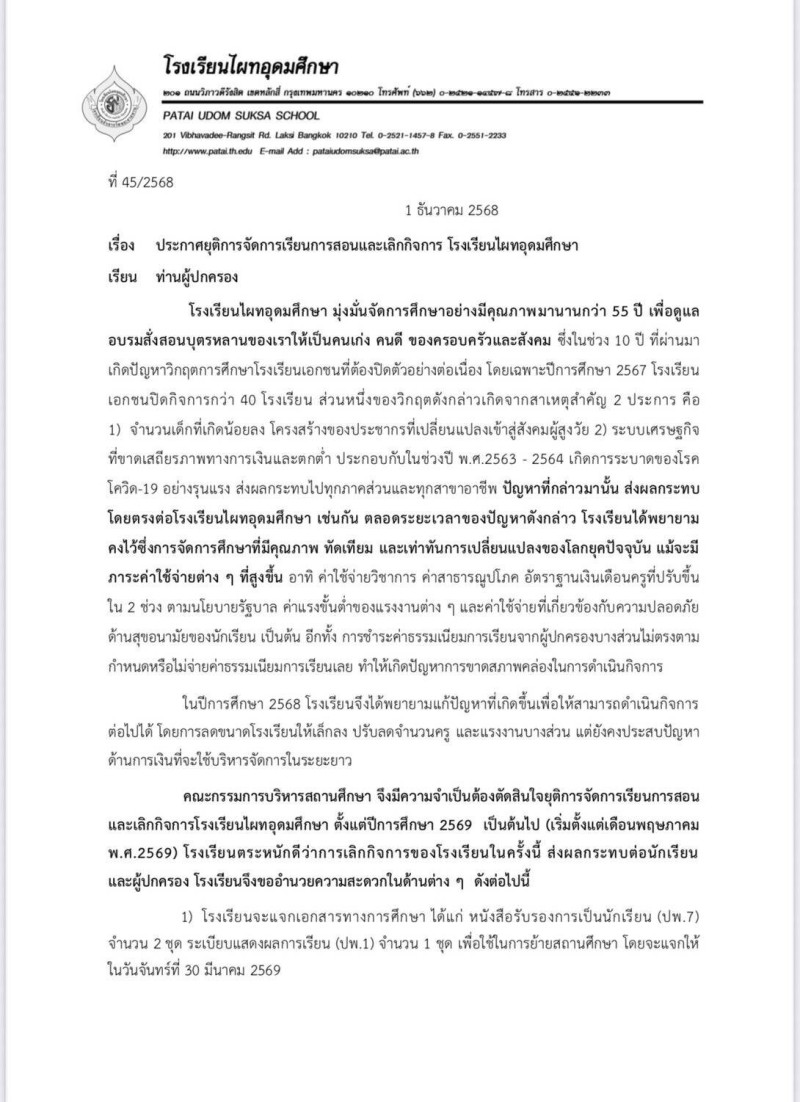 ทั้งนี้ โรงเรียนไผทอุดมศึกษา ขอเชิญท่านผู้ปกครองเข้าร่วมประชุมรับทราบรายละเอียดการยุติกิจการของโรงเรียน และแนวทางการช่วยเหลือในวันพุธที่ 3 ธันวาคม 2568