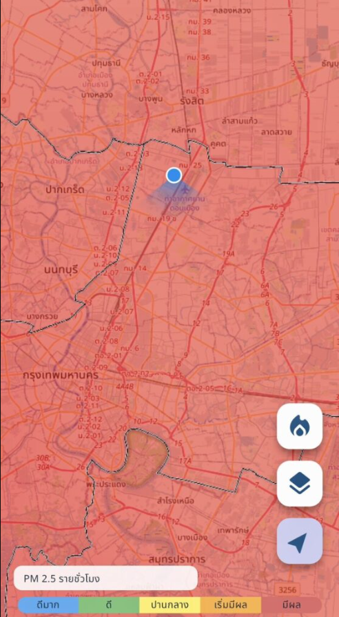 เมื่อวันที่ 2 ธันวาคม GISTDA อัพเดตค่าฝุ่น PM2.5 จากแอปพลิเคชัน เช็คฝุ่น เมื่อเวลา 06.00 น. ของวันที่ 2 ธ.ค. ทั่วประเทศมีคุณภาพอากาศอยู่ในระดับ เกินมาตรฐานระดับสีแดง ที่มีผลกระทบต่อสุขภาพและ ระบบทางเดินหายใจแล้ว 15 จังหวัด และระดับสีส้ม 25 จังหวัดที่เริ่มจะมีผลต่อ สุขภาพและระบบทางเดินหายใจ