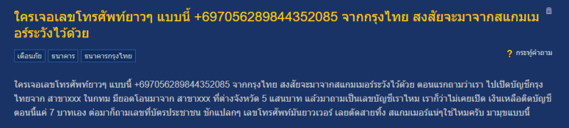 วันที่ 2 ธันวาคม 2568 ได้มี สมาชิกเว็บไซต์พันทิปดอทคอมรายหนึ่ง ทำการตั้งกระทู้ถามเรื่อง ใครเจอเลขโทรศัพท์ยาวๆ แบบนี้ +697056289844352085 จากกรุงไทย สงสัยว่าจะมาจากสแกมเมอร์ระวังไว้ด้วย โดยรายละเอียดเนื้อหามีดังนี้