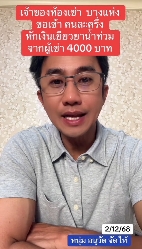 อนุวัต เฟื่องทองแดง ผู้ประกาศข่าวชื่อดัง โพสต์คลิปแฉเจ้าของบ้านเช่าและหอพักบางแห่ง ขอส่วนแบ่งเงินเยียวยาน้ำท่วมจากผู้เช่าสูงถึง 4,000 บาท แลกกับลายเซ็นรับรองเอกสาร วอนเห็นใจผู้ประสบภัยที่ข้าวของเสียหายหนัก