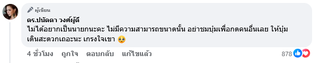 ก่อนที่จะคอมเมนต์ต่อในโพสต์ดังกล่าวว่า ไม่ได้อยากเป็นนายกนะคะ ไม่มีความสามารถขนาดนั้น อย่าชมบุ๋มเพื่อกดคนอื่นเลย ให้บุ๋มเดินสะดวกเถอะนะ เกรงใจเขา