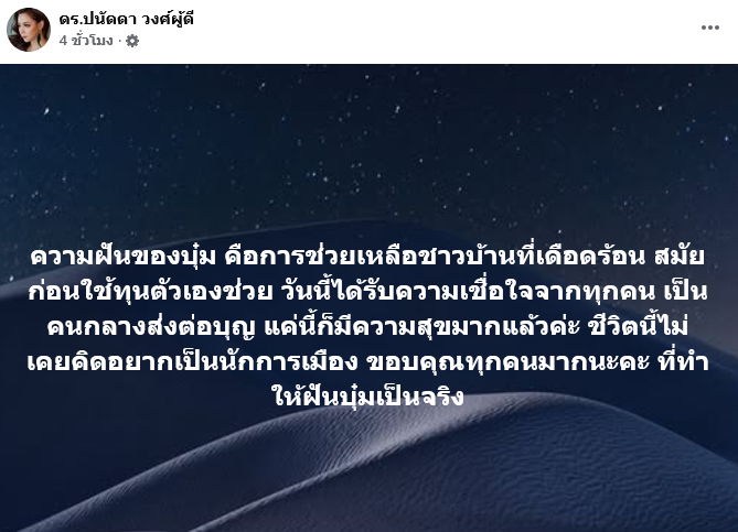 เมื่อวันที่ 4 ธันวาคม 2568 ดร.ปนัดดา วงศ์ผู้ดี หรือที่เราเรียกติดปากกันว่า บุ๋ม ปนัดดา ได้ออกมาโพสต์ข้อความถึงความฝันของตนเอง ผ่านเฟซบุ๊ก ดร.ปนัดดา วงศ์ผู้ดี โดยระบุว่า ความฝันของบุ๋ม คือการช่วยเหลือชาวบ้านที่เดือดร้อน สมัยก่อนใช้ทุนตัวเองช่วย วันนี้ได้รับความเชื่อใจจากทุกคน เป็นคนกลางส่งต่อบุญ แค่นี้ก็มีความสุขมากแล้วค่ะ ชีวิตนี้ไม่เคยคิดอยากเป็นนักการเมือง ขอบคุณทุกคนมากนะคะ ที่ทำให้ฝันบุ๋มเป็นจริง