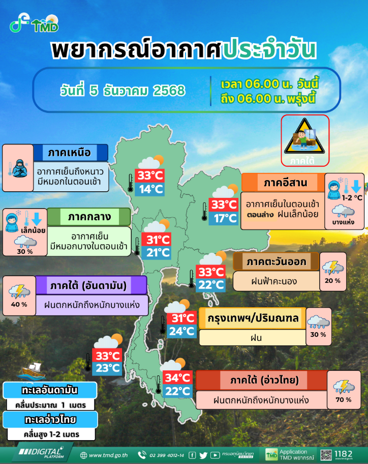 วันที่ 5 ธันวาคม 2568 กรมอุตุนิยมวิทยา พยากรณ์อากาศ 24 ชั่วโมงข้างหน้า ภาคใต้มีฝนเพิ่มขึ้นและมีฝนตกหนักถึงหนักมากบางแห่ง โดยเฉพาะบริเวณจังหวัดนครศรีธรรมราช พัทลุง สงขลา ปัตตานี ยะลา นราธิวาส พังงา ภูเก็ต ตรัง และสตูล ส่วนประเทศไทยตอนบน มีฝน/ฝนฟ้าคะนองเกิดขึ้นได้บางพื้นที่บริเวณภาคตะวันออกเฉียงเหนือตอนล่างและภาคตะวันออก แต่ยังคงมีอากาศเย็นในตอนเช้า ขอให้ประชาชนบริเวณภาคใต้ระวังอันตรายจากฝนตกหนักและฝนที่ตกสะสม ส่วนประชาชนในบริเวณประเทศไทยตอนบนดูแลรักษาสุขภาพจากสภาพอากาศที่เปลี่ยนแปลง และเพิ่มความระมัดระวังในการสัญจรผ่านบริเวณที่มีหมอก