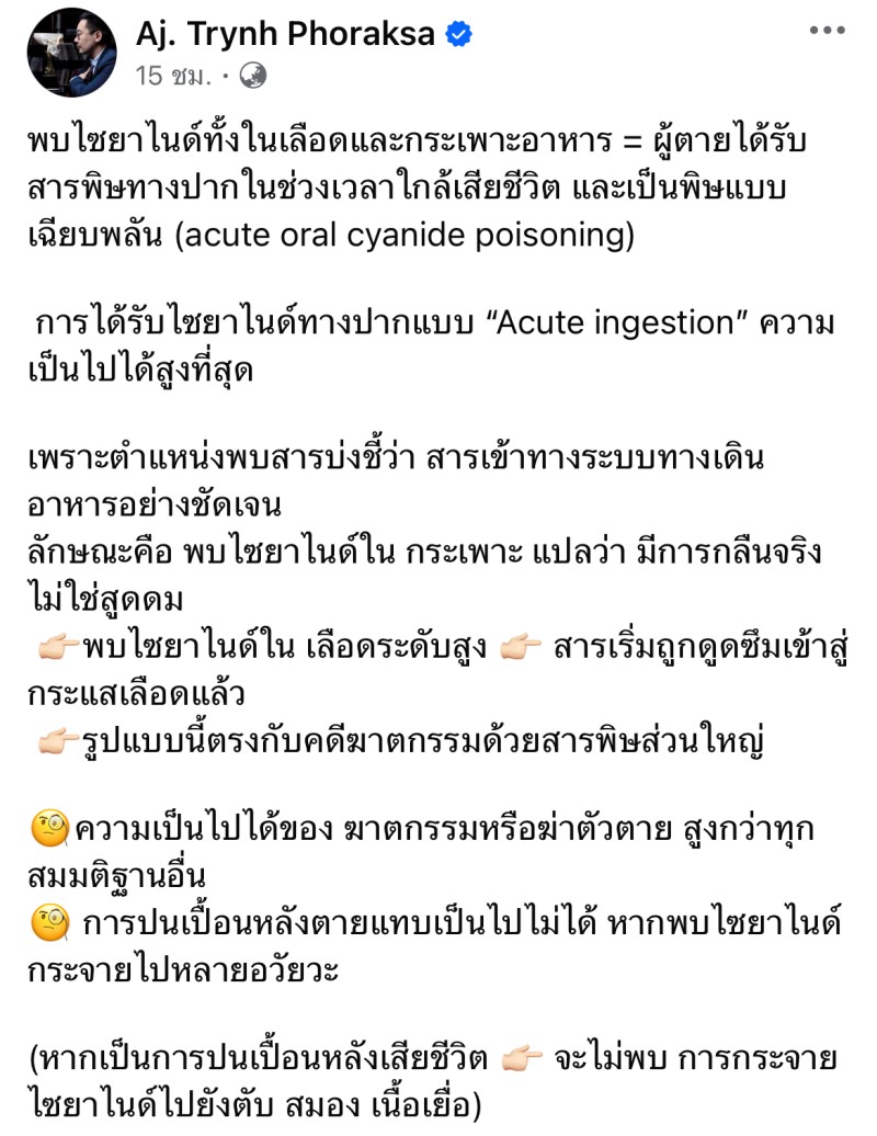 ล่าสุด ดร.ตฤณห์ โพธิ์รักษา นักอาชญาวิทยาเชิงจิตวิทยาและพฤติกรรมอาชญากร ได้โพสต์ข้อความระบุว่า พบไซยาไนด์ทั้งในเลือดและกระเพาะอาหาร = ผู้เสียชีวิตได้รับสารพิษทางปากในช่วงเวลาใกล้เสียชีวิต และเป็นพิษแบบเฉียบพลัน (acute oral cyanide poisoning)