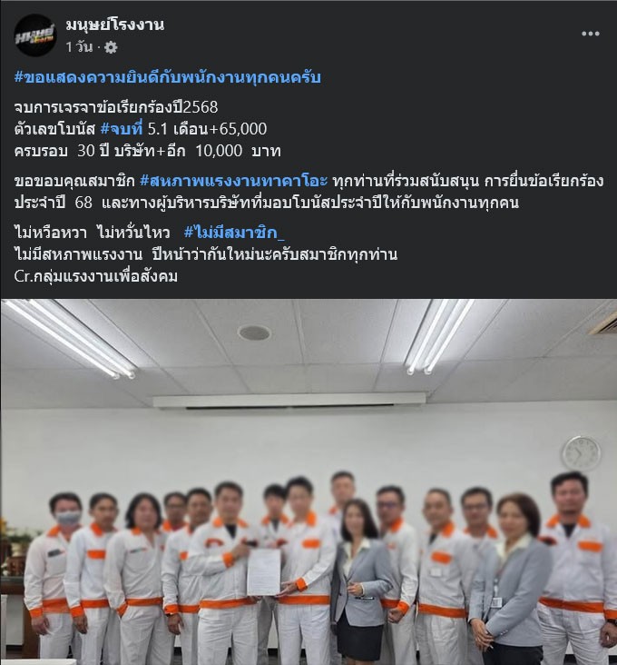 วันที่ 6 ธันวาคม 2568 มีรายงานว่า โลกออนไลน์มีการแชร์ภาพเรื่องราวของผู้ใช้เพจเฟซบุ๊กชื่อ มนุษย์โรงงาน พร้อมระบุข้อความว่า ขอแสดงความยินดีกับพนักงานทุกคนครับ จบการเจรจาข้อเรียกร้องปี 2568