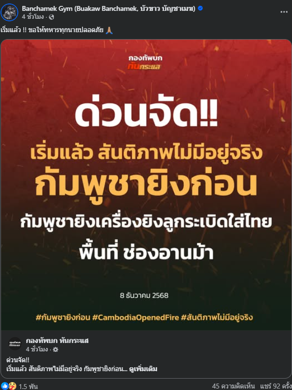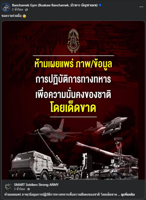 และได้แชร์ข้อมูลจากเพจกองทัพบก ทันกระแส ขอความร่วมมือ ห้ามเผยแพร่ภาพหรือข้อมูลการปฏิบัติการทางทหารเพื่อความมั่นคงของชาติ โดยเด็ดขาด