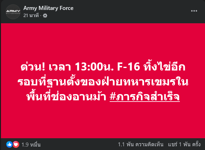 วันที่ 8 ธันวาคม 2568 มีรายงานว่า เวลา 13:00 น. F-16 ทิ้งไข่อีกรอบที่ฐานตั้งของฝ่ายทหารเขมรในพื้นที่ช่องอานม้า #ภารกิจสำเร็จ