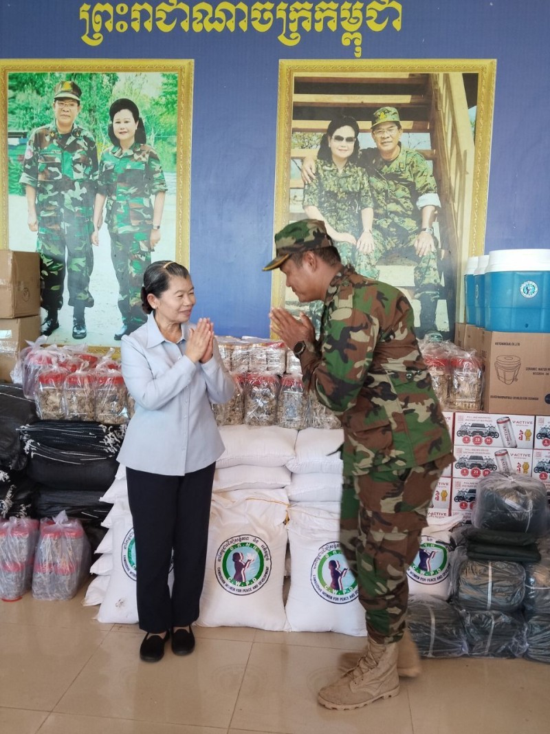 ภาพจอมพลหญิง สมเด็จกิตติสังคหบัณฑิต (แมน สัมอล) รองนายกรัฐมนตรี รัฐมนตรีว่าการกระทรวงความสัมพันธ์ระหว่างรัฐสภา, วุฒิสภาและหน่วยงานตรวจตรากัมพูชา, และองค์มนตรีในพระมหากษัตริย์แห่งกัมพูชา เพิ่งเดินทางไปเยี่ยมทหารเขมรที่กองบัญชาการกองพลสนับสนุนที่ 3 เมื่อวันที่ 2 ธ.ค. ที่ผ่านมา