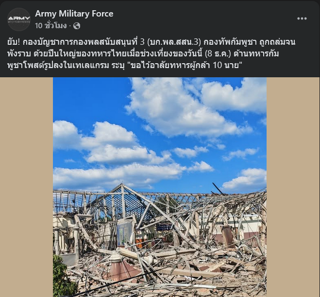 เมื่อวันที่ 8 ธันวาคม 2568 ที่ผ่านมา เพจเฟซบุ๊ก Army Military Force ได้โพสต์ภาพพร้อมระบุข้อความว่า ยับ! กองบัญชาการกองพลสนับสนุนที่ 3 (บก.พล.สสน.3) กองทัพกัมพูชา ถูกถล่มจนพังราบ ด้วยปืนใหญ่ของทหารไทยเมื่อช่วงเที่ยงของวันนี้ (8 ธ.ค.) ด้านทหารกัมพูชาโพสต์รูปลงในเทเลแกรม ระบุ "ขอไว้อาลัยทหารผู้กล้า 10 นาย"
