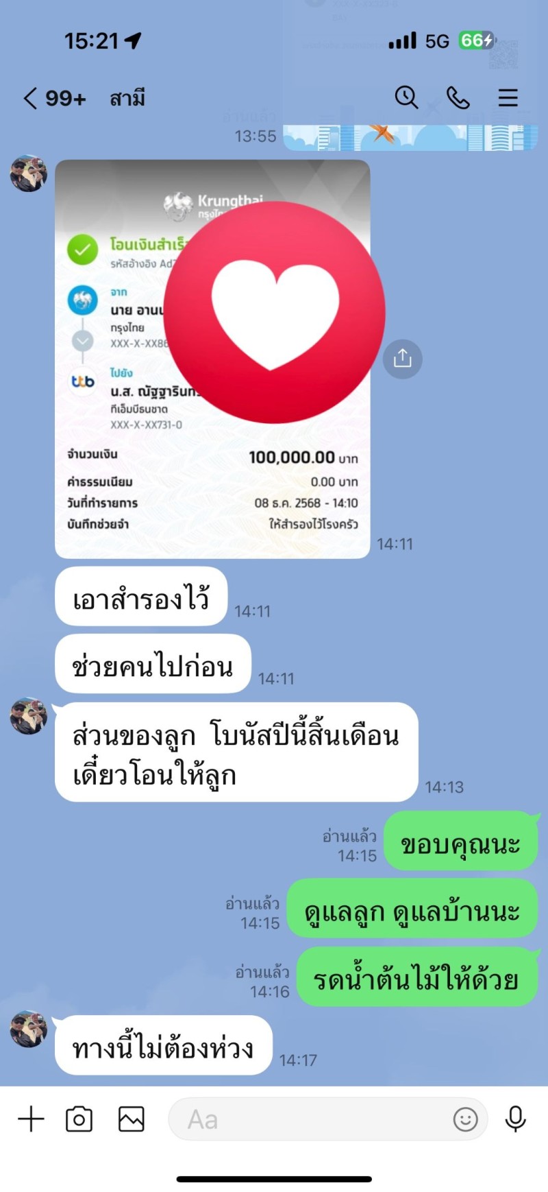 ซึ่งทางสามีเจ๊เอ๋ ได้โอนเงินไป1แสนบาท เพื่อเอาไปช่วยชาวบ้านที่อพยพจากการปะทะชาวแดนไทยกัมพูชา พอได้เห็นแชทที่สามีเจ๊เอ๋พิมพ์ไว้ บอกเอาสำรองไว้ ช่วยคนไปก่อน ทางนี้ไม่ต้องห่วง