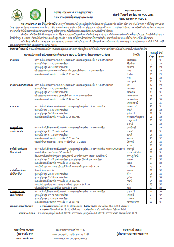 วันที่ 10 ธันวาคม 2568 กรมอุตุนิยมวิทยา พยากรณ์อากาศ 24 ชั่วโมงข้างหน้า ประเทศไทยตอนบนมีอุณหภูมิสูงขึ้นกับมีหมอกบางในตอนเช้า แต่ยังคงมีอากาศเย็นถึงหนาว ขอให้ประชาชนดูแลรักษาสุขภาพเนื่องจากสภาพอากาศที่หนาวเย็น และเพิ่มความระมัดระวังในการสัญจรผ่านบริเวณที่มีหมอก รวมถึงระวังอันตรายจากอัคคีภัยที่อาจเกิดขึ้นจากสภาพอากาศแห้ง ทั้งนี้เนื่องจากบริเวณความกดอากาศสูงหรือมวลอากาศเย็นที่ปกคลุมประเทศไทยตอนบนเริ่มมีกำลังอ่อนลง