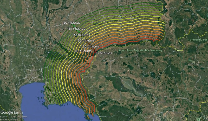 นี่เป็นภาพจากการวิเคราะห์ข้อมูลที่ถูกเปิดเผยโดย เพจ มิตรเอิร์ธ - mitrearth วิเคราะห์เทียบกับ Google Map แสดงให้เห็นว่า จังหวัดไหนเข้าข่ายอยู่ในพิสัยยิงของกัมพูชาบ้าง