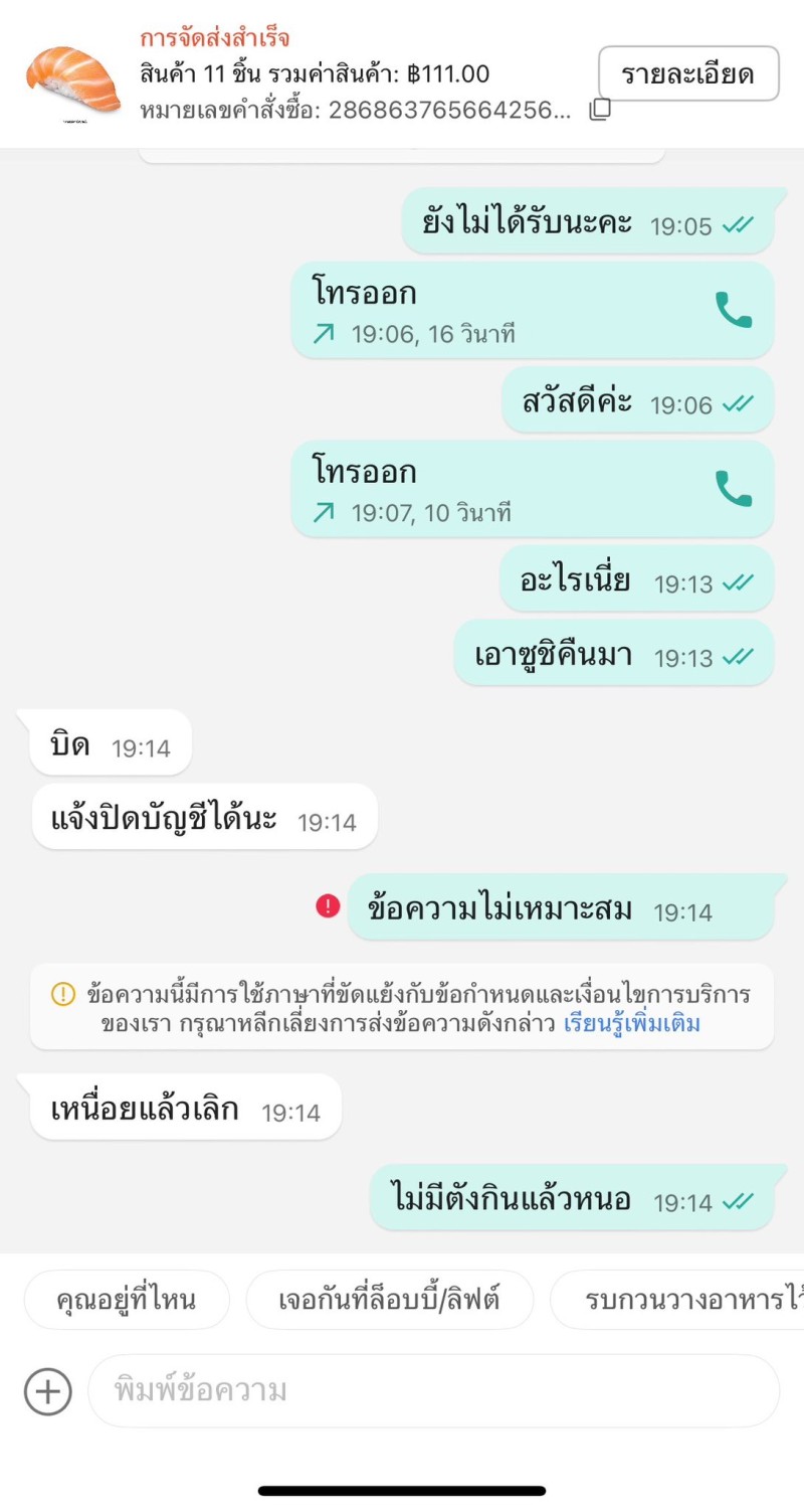 เราสั่งชูชิค่ะ สถานะขึ้นว่ากำลังจัดส่งปกติ สักพักขึ้นจัดส่งสำเร็จแต่เราอยู่ที่บ้าน ไม่มีอะไรมาส่งเลย พอโทรไปก็แกล้งบ้าเราเลยแจ้งยกเลิกขอเงินคืน แล้วก็ตามภาพเลยค่ะ
