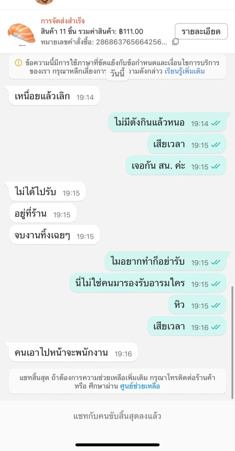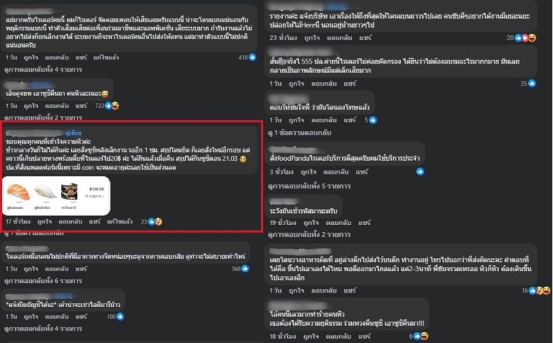 เจ้าของโพสต์ยังคอมเมนต์เพิ่มเติมระบุว่า ขอบคุณทุกคนที่เข้าใจความหิวค่ะ ข้าวกลางวันก็ไม่ได้กินค่ะ เลยสั่งซูชิหลังเลิกงาน รออีก 1 ชม. สรุปโดนบิด ก็เลยสั่งใหม่อีกรอบ แต่คราวนี้เก็บปลายทางพร้อมติ้บพี่ไรเดอร์ไป20฿ ค่ะ ได้กินแล้วเมื่อคืน สรุปได้กินซูชิตอน 21.03 ปล.ที่สั่งแพลตฟอร์มนี้เพราะมี coin จะหมดอายุค่ะเลยใช้เป็นส่วนลด