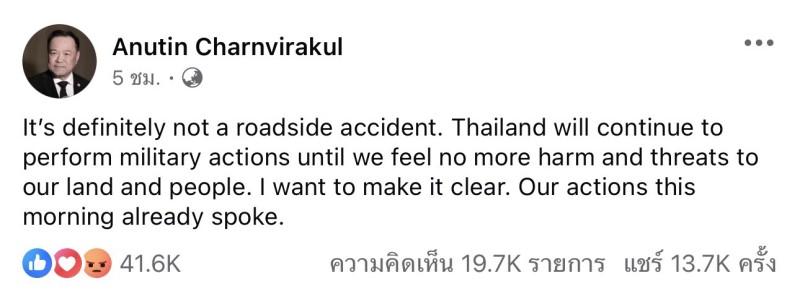 ล่าสุด นายอนุทิน ชาญวีรกูล ได้ออกมาตอบโต้ โดนัลด์ ทรัมป์ ด้วยการโพสต์เฟซบุ๊คส่วนตัว โดยระบุข้อความแปลเป็นไทยได้ว่า ไม่ใช่อุบัติเหตุริมถนนอย่างแน่นอน ประเทศไทยจะดำเนินการทางทหารต่อไป จนกว่าเราจะไม่รู้สึกถึงอันตราย และภัยคุกคามต่อแผ่นดิน และประชาชนของเราอีกต่อไป ผมอยากจะทำให้ชัดเจน การกระทำของเราเมื่อเช้านี้ได้บ่งบอกแล้ว