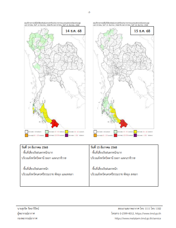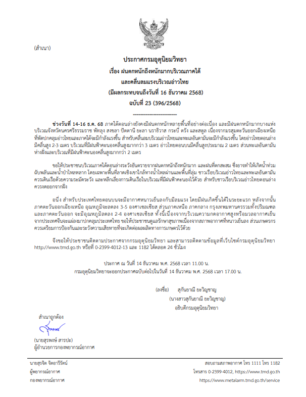 วันที่ 14 ธ.ค.2568 กรมอุตุนิยมวิทยา ประกาศ เรื่อง ฝนตกหนักถึงหนักมากบริเวณภาคใต้ และคลื่นลมแรงบริเวณอ่าวไทย (มีผลกระทบจนถึงวันที่ 16 ธันวาคม 2568) ฉบับที่ 23 (396/2568) ช่วงวันที่ 14-16 ธ.ค. 68 ภาคใต้ตอนล่างยังคงมีฝนตกหนักหลายพื้นที่อย่างต่อเนื่อง และมีฝนตกหนักมากบางแห่ง บริเวณจังหวัดนครศรีธรรมราช พัทลุง สงขลา ปัตตานี ยะลา นราธิวาส กระบี่ ตรัง และสตูล เนื่องจากมรสุมตะวันออกเฉียงเหนือที่พัดปกคลุมอ่าวไทยและภาคใต้จะมีกำลังแรงขึ้น สำหรับคลื่นลมบริเวณอ่าวไทยและทะเลอันดามันจะมีกำลังแรงขึ้น โดยอ่าวไทยตอนล่างมีคลื่นสูง 2-3 เมตร บริเวณที่มีฝนฟ้าคะนองคลื่นสูงมากกว่า 3 เมตร อ่าวไทยตอนบนมีคลื่นสูงประมาณ 2 เมตร ส่วนทะเลอันดามันห่างฝั่งและบริเวณที่มีฝนฟ้าคะนองคลื่นสูงมากกว่า 2 เมตร