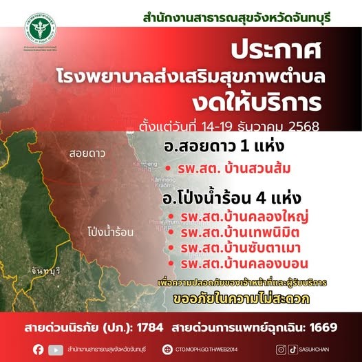 วันที่ 15 ธันวาคม 2568 เพจเฟซบุ๊ก กรมประชาสัมพันธ์ ประกาศเเจ้ง โดยระบุว่า สำนักงานสาธารณสุขจังหวัดจันทบุรี ขอแจ้งประชาชนทราบ งดให้บริการชั่วคราว โรงพยาบาลส่งเสริมสุขภาพตำบล (รพ.สต.) ในพื้นที่ อำเภอโป่งน้ำร้อน 4 แห่ง และ อำเภอสอยดาว 1 แห่ง ตั้งแต่วันที่ 14 - 19 ธันวาคม 2568