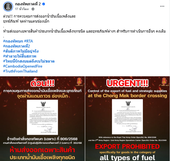 ตามคำสั่งกองทัพบก เรื่องการควบคุม การเปิด - ปิดจุดผ่านแดน ทุกประเภทตามแนวชายแดนไทย - กัมพูชา ให้กองทัพภาคที่ 2 โดยกองกำลังสุรนารี มีอำนาจการควบคุมการเปิด ปิดจุดผ่านแดนทุกประเภท ในพื้นที่รับผิดชอบของกองกำลังสุรนารี โดยมีคำสั่ง ห้ามส่งออกสินค้าประเภทน้ำมันเชื้อเพลิงทุกชนิด รวมถึงยุทธภัณฑ์ต่าง ๆ เป็นการเฉพาะ ส่วนการดำเนินการด้านอื่นยังคงเป็นไปตามปกติ มาตรการดังกล่าวมีผลบังคับใช้ ตั้งแต่เวลา 24.00 นาฬิกา ของวันที่ 14 ธันวาคม 2568 เป็นต้นไป เพื่อควบคุมความมั่นคงตามแนวชายแดนอย่างเข้มงวด