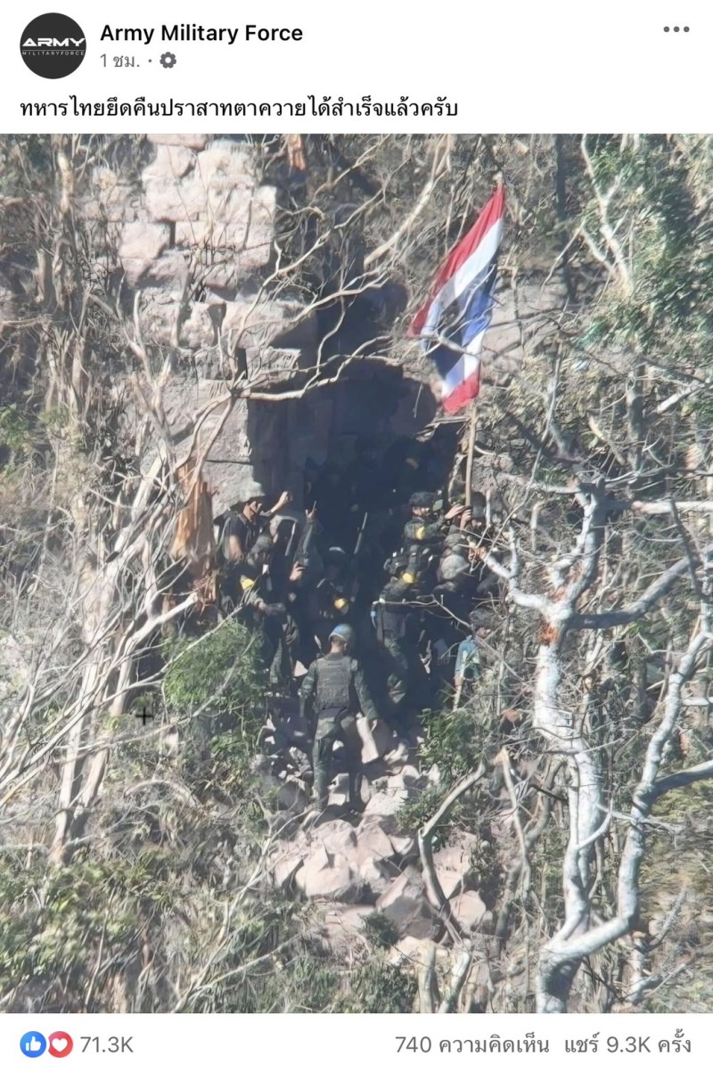 โดยเพจเฟซบุ๊ก Army Military Force ได้เผยแพร่คลิป พร้อมระบุว่า ทหารไทยยึดคืนปราสาทตาควายได้สำเร็จแล้วครับ