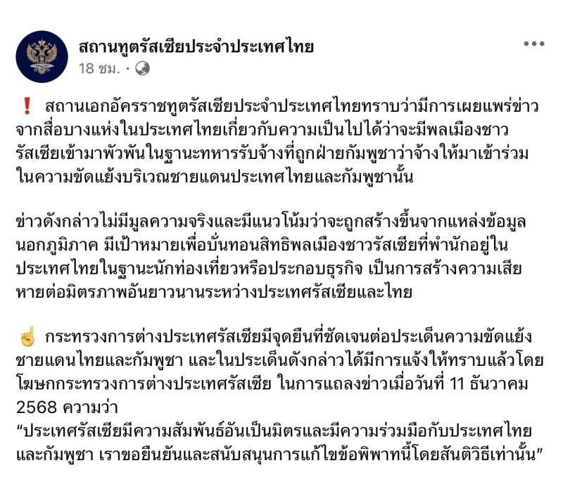 ท่ามกลางกระแสข่าวที่ถูกเผยแพร่ในสื่อบางแห่งของประเทศไทย อ้างถึงความเป็นไปได้ว่าจะมีพลเมืองชาวรัสเซียเข้าไปพัวพันในฐานะทหารรับจ้าง ที่ถูกฝ่ายกัมพูชาว่าจ้างให้เข้าร่วมความขัดแย้งบริเวณชายแดนไทย–กัมพูชา ล่าสุดสถานเอกอัครราชทูตรัสเซียประจำประเทศไทย ได้ออกแถลงการณ์ชี้แจงผ่านเพจเฟซบุ๊คแล้วครับ