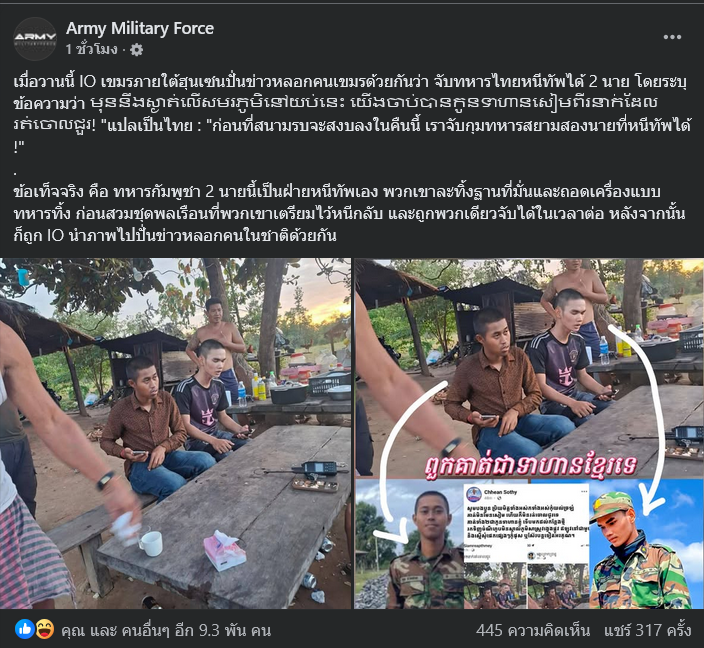 วันที่ 16 ธันวาคม 2568 เพจเฟซบุ๊ก Army Military Force รายงานว่า เมื่อวานนี้ IO เขมรภายใต้ฮุนเซนปั่นข่าวหลอกคนเขมรด้วยกันว่า จับทหารไทยหนีทัพได้ 2 นาย โดยระบุข้อความว่า មុននឹងស្ងាត់លើសមរភូមិនៅយប់នេះ យើងចាប់បានកូនទាហានសៀមពីរនាក់ដែលរត់ចោលជួរ! "แปลเป็นไทย : "ก่อนที่สนามรบจะสงบลงในคืนนี้ เราจับกุมทหารสยามสองนายที่หนีทัพได้!
