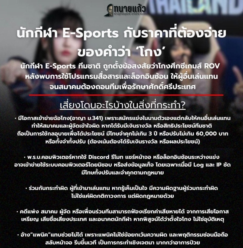 วันที่ 18 ธันวาคม 2568 ทนายแก้วได้โพสต์ผ่านเพจเฟซบุ๊กส่วนตัว ระบุถึงความเสี่ยงทางกฎหมายจากกรณีทุจริตของนักกีฬา E-Sports ทีมชาติไทย ในการแข่งขัน RoV ศึกซีเกมส์ที่ผ่านมา โดยชี้ว่าผู้เกี่ยวข้องอาจต้องเผชิญความผิดหลายด้าน ไม่ใช่เพียงแค่การผิดกติกาการแข่งขัน