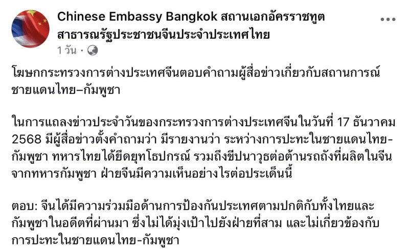 โดย สถานเอกอัครราชทูตจีนประจำประเทศไทย ก็ได้ออกมาชี้แจงผ่านเพจเฟสบุ๊ค โดยระบุว่า จีนมีความร่วมมือด้านการป้องกันประเทศกับทั้งไทยและกัมพูชาเป็นเวลานาน รวมถึงการค้าอาวุธ ความร่วมมือนี้ไม่ได้มุ่งเป้าไปที่ฝ่ายที่สามใด ๆ ปฏิบัติตามกฎหมายและหลักปฏิบัติระหว่างประเทศอย่างครบถ้วน และไม่เกี่ยวข้องกับสถานการณ์การปะทะบริเวณชายแดนระหว่างไทยและกัมพูชาแต่อย่างใด เราหวังว่าฝ่ายที่เกี่ยวข้องจะงดเว้นจากการคาดเดาตามอำเภอใจและสร้างกระแสข่าวที่มีเจตนาร้าย