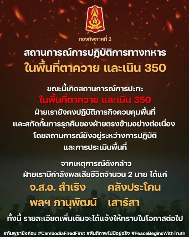 โดยกองทัพภาคที่ 2 รายงานว่า ได้พบร่างกำลังพลทหารที่เสียชีวิต 2 นายคือ จ่าสิบเอกสำเริง คลังประโคน และ พลทหารภานุพัฒน์ เสาร์สา ในพื้นที่ปฏิบัติการ โดยขณะนี้อยู่ระหว่างการเคลื่อนย้ายร่างวีรบุรุษทั้งสองนายกลับมายังพื้นนที่ส่วนหลัง กองทัพยืนยันจะดูแลพื้นที่และความปลอดภัยของกำลังพลอย่างเต็มที่ พร้อมปกป้องอธิปไตยของชาติอย่างถึงที่สุด