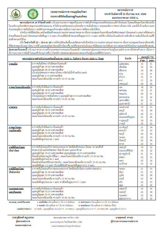 อนึ่ง ในช่วงวันที่ 25 – 28 ธ.ค. 68 ภาคใต้จะมีฝนเพิ่มขึ้นและมีฝนตกหนักถึงหนักมากบางแห่งทางตอนล่างของภาค เนื่องจากมรสุมตะวันออกเฉียงเหนือที่พัดปกคลุมบริเวณอ่าวไทย ภาคใต้ และทะเลอันดามันจะมีกำลังแรงขึ้น ขอให้ประชาชนบริเวณภาคใต้ตอนล่างระวังอันตรายจากฝนตกหนักถึงหนักมากและฝนที่ตกสะสม