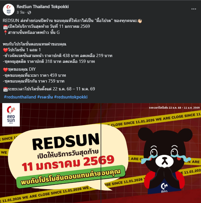 RedSun Thailand Tokpokki โพสต์ข้อความผ่านเพจทางการ ระบุว่า REDSUN ส่งท้ายก่อนปิดร้าน ขอบคุณที่ให้เราได้เป็น มื้อโปรด ของทุกคนนะ พร้อมแจ้งกำหนดวันเปิดให้บริการวันสุดท้าย 11 มกราคม 2569 ซึ่งสาขาเซ็นทรัลลาดพร้าวถือเป็นสาขาสุดท้ายที่ยังคงเปิดอยู่