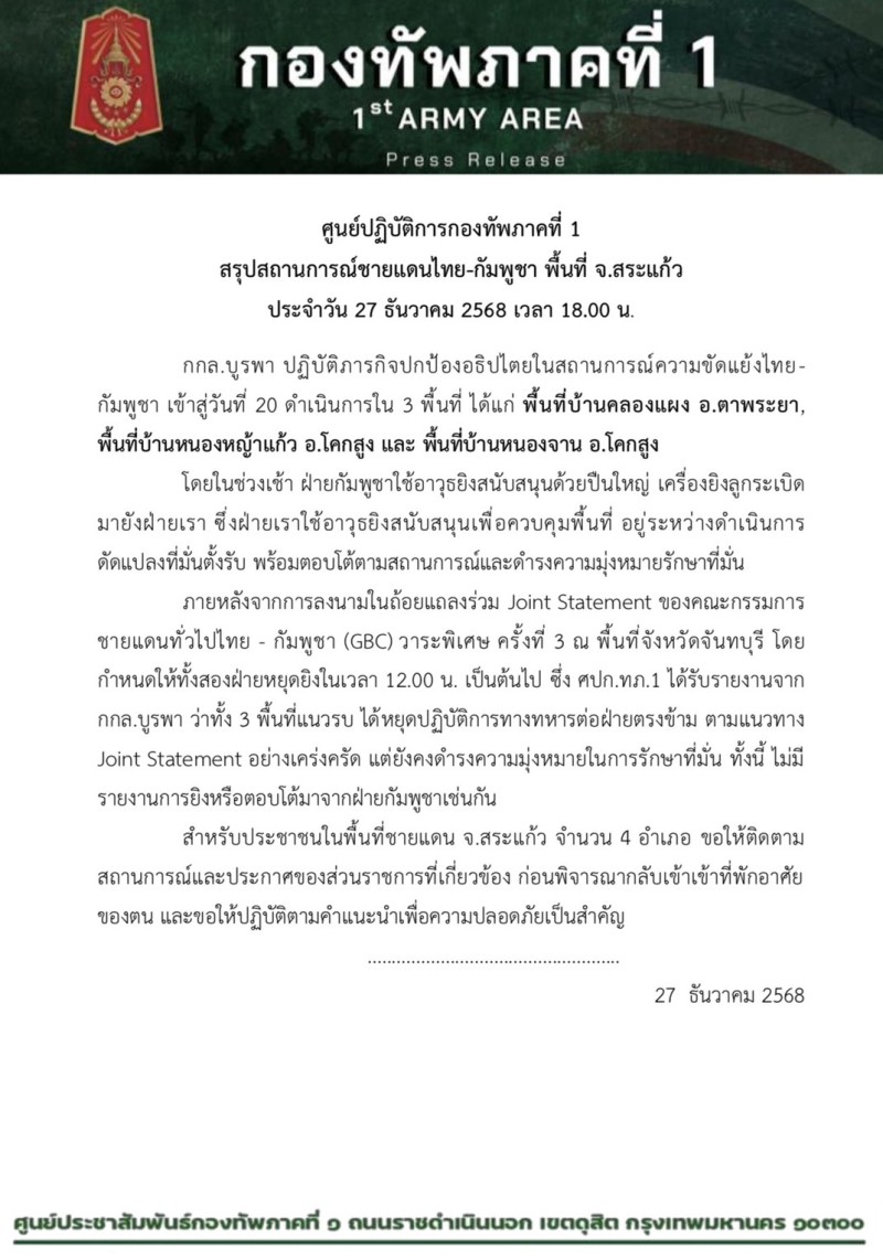 เมื่อวันที่ 27 ธันวาคม 2568 ศูนย์ปฏิบัติการกองทัพภาคที่ 1 รายงานสรุปสถานการณ์ความมั่นคงตามแนวชายแดนไทย-กัมพูชา ในพื้นที่จังหวัดสระแก้ว ประจำเวลา 18.00 น.