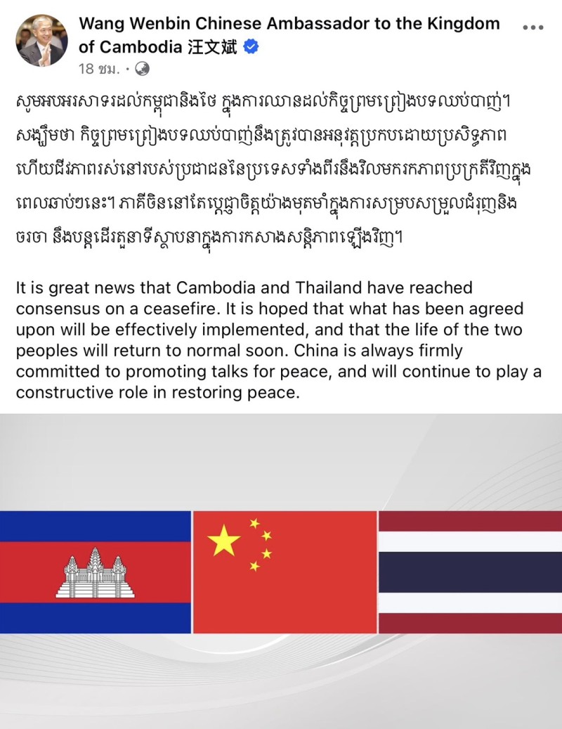 โดยนาย หวัง เหวินปิน ได้โพสต์ข้อความ ผ่านช่องทางเฟสบุ๊ค ส่วนตัวของตน ถึงไทย และ กัมพูชา โดยระบุว่า นับเป็นข่าวที่น่ายินดีที่กัมพูชาและไทยบรรลุฉันทามติเรื่องการหยุดยิง หวังว่าข้อตกลงที่ได้ตกลงกันไว้จะถูกนำไปปฏิบัติอย่างมีประสิทธิผล และให้วิถีชีวิตของประชาชนทั้งสองประเทศกลับสู่ภาวะปกติในเร็ววัน จีนยึดมั่นอย่างแน่วแน่ในการส่งเสริมการเจรจาเพื่อสันติภาพ และจะยังคงมีบทบาทเชิงสร้างสรรค์ในการฟื้นฟูสันติภาพต่อไป