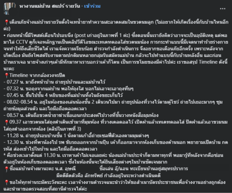 จึงอยากขอเตือนภัยอีกครั้ง เพราะหลังจากเกิดเรื่อง มันยังโพสต์รับงานตามปกติมนหลายกลุ่มรับสมัครแม่บ้าน กลัวจะไปทำแบบนี้กับบ้านหลังอื่น และก่อนบ้านเราเจอ นายจ้างเก่าๆเค้ามีทักมาหาเราบอกว่าเค้าก็โดน เป็นการขโมยของมีค่าไปค่ะ เราขอสรุป Timeline ดังนี้นะคะ