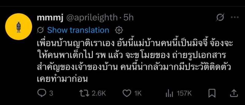 ข้อมูลเพิ่มเติมจาก X ระบุว่า เพื่อนบ้านญาติเราเอง อันนี้แม่บ้านคนนี้เป็นมิจจี้ จ้องจะ ให้คนพาเด็กไป รพ แล้ว จะขโมยของ ถ่ายรูปเอกสาร สำคัญของเจ้าของบ้าน คนนี้น่ากลัวมากมีประวัติติดตัว เคยทำมาก่อน